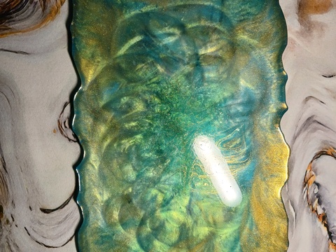 Tava decorativa pentru servire din rasina epoxidica cu reflexiile oceanului din pigmenți turcoaz,albastru,auriu.