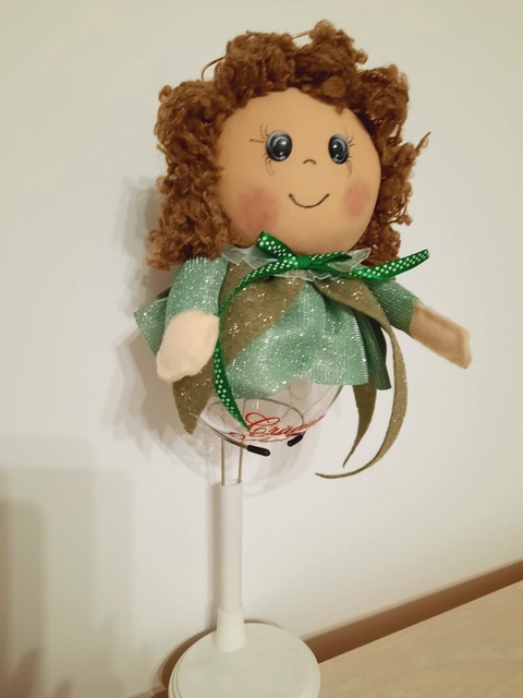 Este confectionat pe baza unui glob de 10 cm, care are un autocolant Craciun fericit. Costumul este din fetru si lycra gliterata, capul este din lycra umplut cu vatelina. Are caciulita din material elastic cu blanita. In glob este o mini instalatie cu leduri. Este decorat cu funde. Are 20 cm.