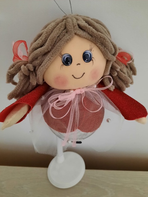 Este confectionata pe baza unui glob de 10 cm. Costumul este din lycra gliterata si tul cu perlute, capul este din lycra umplut cu vatelina. In glob este o mini instalatie cu leduri si stelute colorate exterioare. Este decorata cu funde. Are 20 cm.