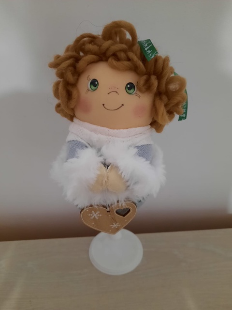 Este confectionat pe baza unui glob de 10 cm. Costumul este din lycra gliterata, capul este din lycra umplut cu vatelina. Are caciulita din material elastic cu blanita. Gloul este imbracat in lycra gliterat.Este decorat cu funde, blanita si clopotel.Are 20 cm.