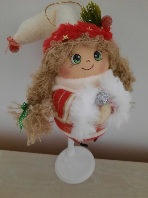 Este confectionata pe baza unui glob de 10 cm. Costumul este din lycra gliterata, capul este din lycra umplut cu vatelina. Are caciulita din material elastic pufos cu blanita. Globul este imbracat in lycra gliterat.Este decorat cu funde, blanita si elemente de iarna.Are 20 cm.