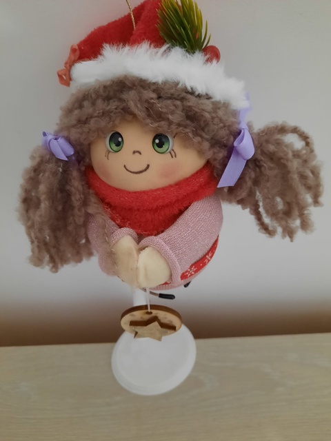 Este confectionata pe baza unui glob de 10 cm. Costumul este din lycra gliterata, capul este din lycra umplut cu vatelina. Are caciulita din material elastic pufos cu blanita. Globul este imbracat in lycra gliterat.Este decorat cu funde, blanita si elemente de iarna.Are 20 cm.