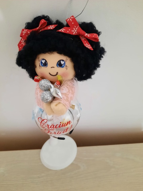 Este confectionata pe baza unui glob de 6 cm. Capul este din lycra umplut cu vatelina.  Globul este decorat cu autocolant Craciun fericit si stelute colorate. Este decorata cu funde si elemente de iarna. Are 17 cm.