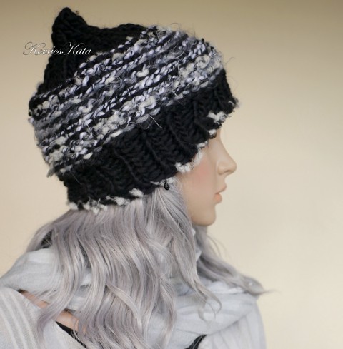 LUCA-SAPI / negru și alb - Șapcă boemă din lână tricotată manual