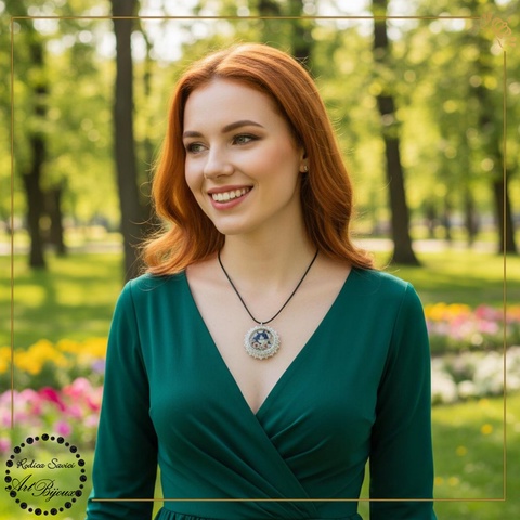 - Material: cabochon sticlă, mărgele, bază șnur cerat, închidere metalică tip carabină, lănțișor prelungitor