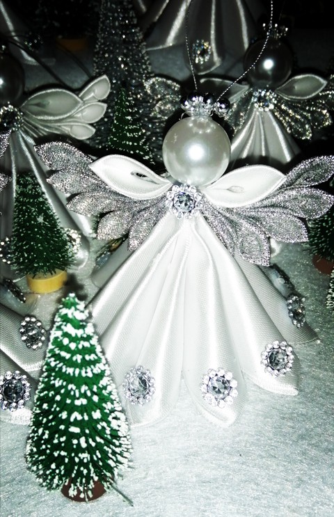 - Material: panglică din satin, panglică argintie, perlă, strasuri, cordon argintiu, simțit, mărgele argintii