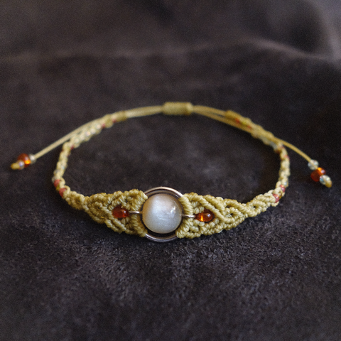 - Material: ață cerată, mărgele din sticlă și rășină