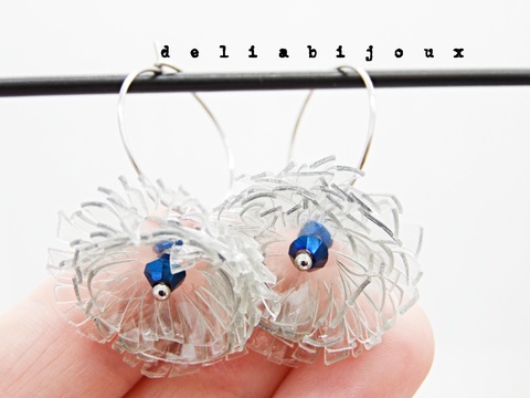 Cercei statement Păpădii de lumină realizați manual din plastic reciclat și cristal albastru electroplacat (cod1327)