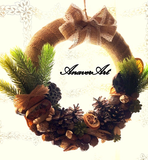 - Material: conuri de brad, coronita din paie, elemente natural uscate, panglica iuta