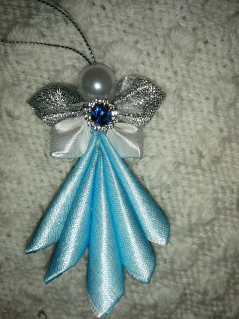 - Material: panglică de satin, simțit, strasuri, panglică de argint, perla