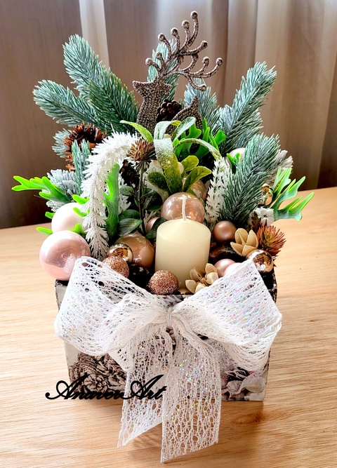 - Material: crengi artificiale, lumanare, cutie carton, globuri, elemnte natural uscate