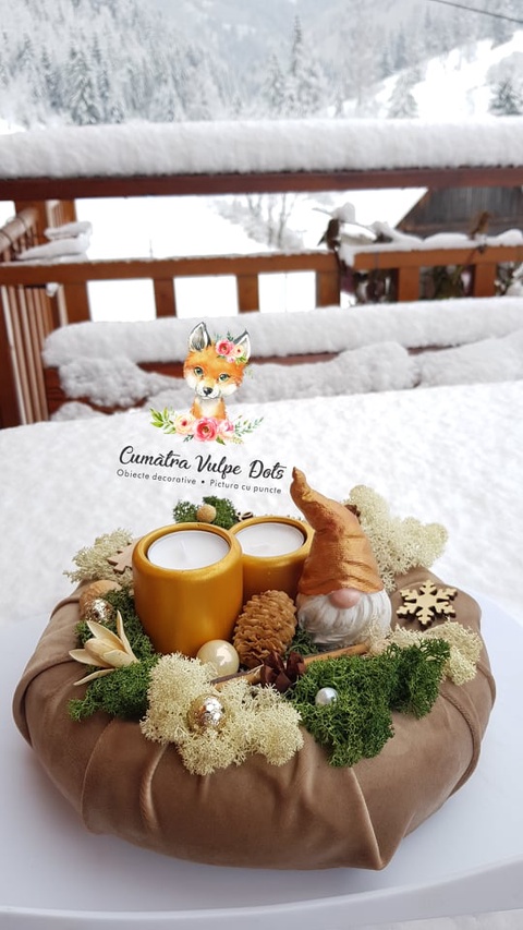 Decorațiune de iarnă cu licheni - cu un gnom și lumânări - auriu