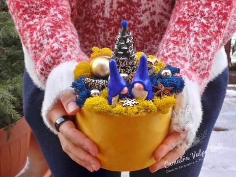 Decorațiune de iarnă cu licheni - cu doi gnomi și brăduț în cutie de catifea
