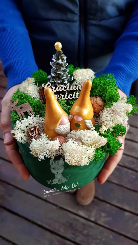Decorațiune de iarnă cu licheni - cu doi gnomi și brăduț în cutie de catifea