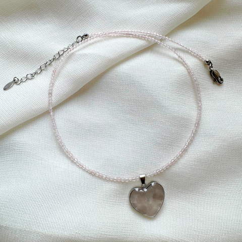 Colier la baza gatului din cuart roz cu pandantiv inima