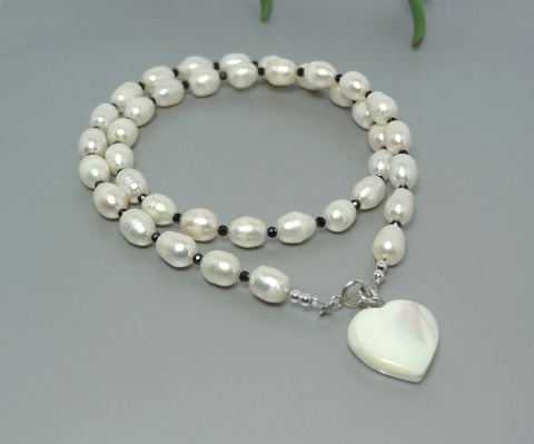 Colier perle de cultura, turmalina neagra si pandantiv inima detasabil
