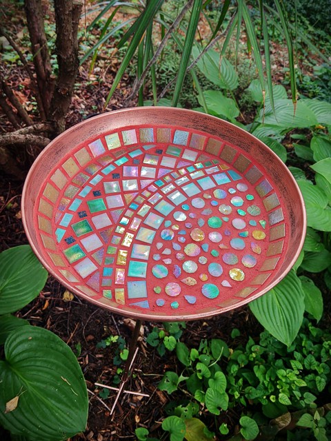 REKREDENC - Mâncător de păsări din bronz realizat manual cu mozaic din sticlă iridescentă - pentru grădină și terasă