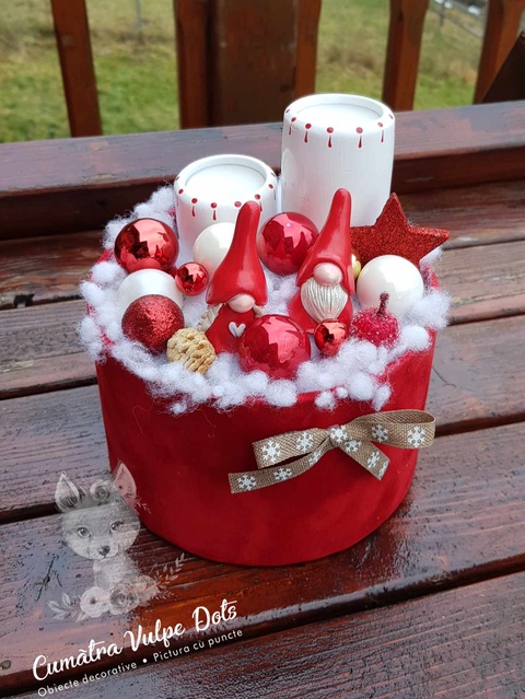 Decorațiune de iarnă - cu doi gnomi și brăduț în cutie medie de catifea rosie
