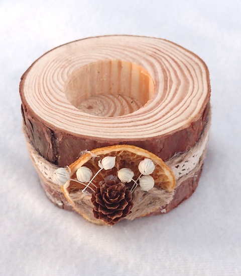 Decorațiune din lemn cu suport pentru lumânare și elemente naturale