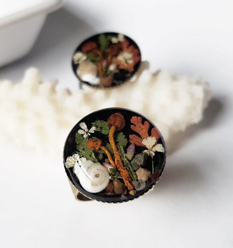 - Material: rasina epoxidica, baza inel otel inoxidabil, cochilie melc, ciuperca uscata, flori si frunze uscate, plante uscate, flori nu ma uita, flori myosotis, feriga, flori queen anne