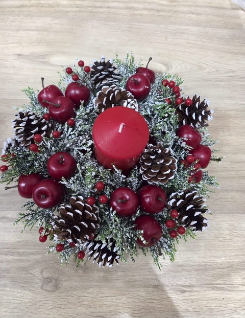 - Material: comuri de brad, lumanare, mere decorative, globuri
