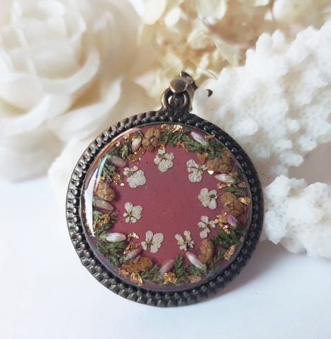 - Material: flori naturale, frunze naturale, accesorii antichizate de culoarea bronzului, vopsea, rasina epoxidica