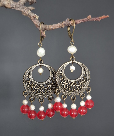 Cercei candelabru cu agat și perle naturale FRAMBOISE D'HIVER