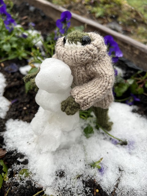 Fată broască tricotată manual în pulover strălucitor, 13 cm