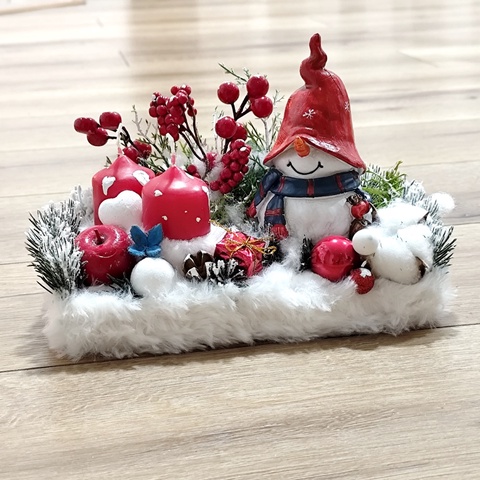 - Material: globuri, lemn, om de zapada, lumanari, zapada artificiala