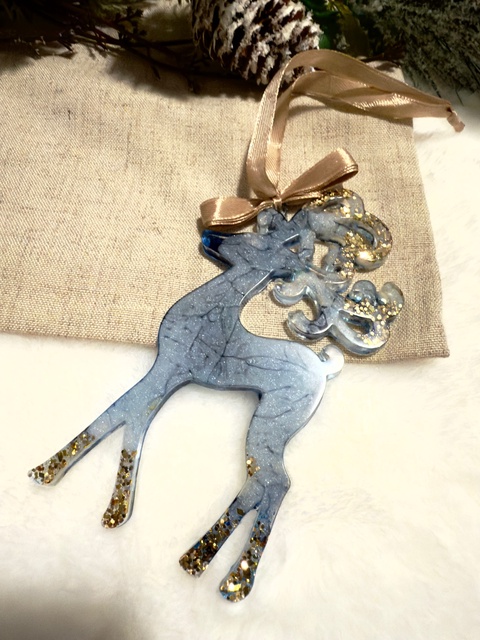 - Material: rasina epoxidica, pigment albastru, pigment alb, sclipici, pamblica, saculet organza