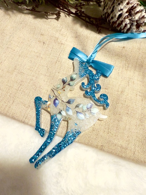 - Material: rasina epoxidica, pigment alb, sclipici albastru, saculet organza, pamblica