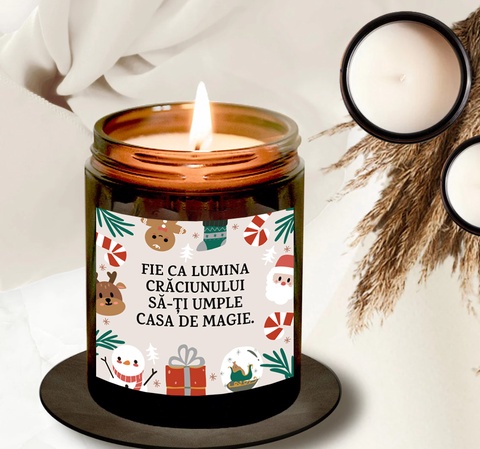 Lumanare parfumata din ceara naturala, in recipient de sticla cu capac, cadou cu eticheta Craciun
