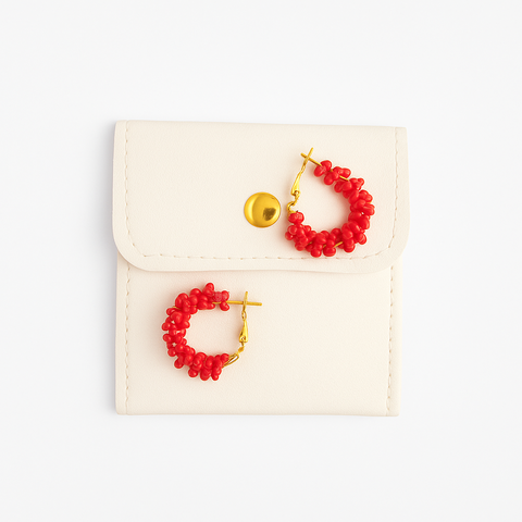 Cercei rotunzi aurii cu pietre rosii, cu plic din piele alb