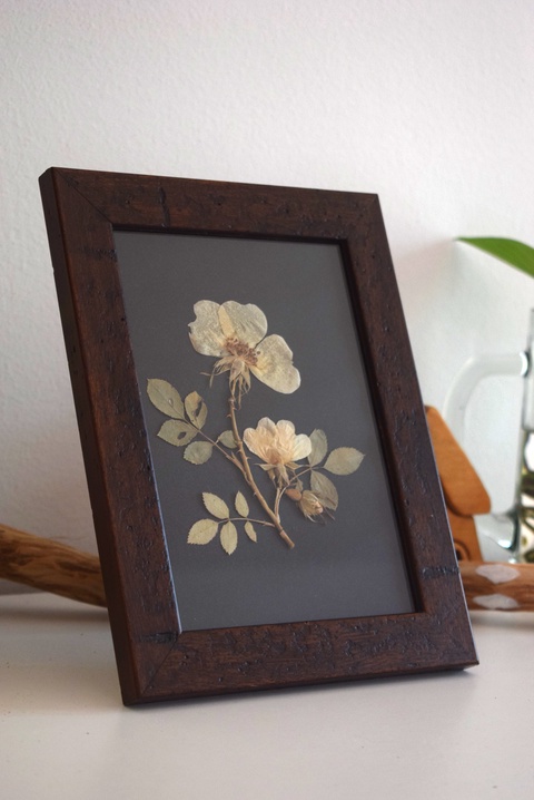 - Material: rama vintage maro, sticla, adeziv floral, plante presate, trandafir salbatic uscat