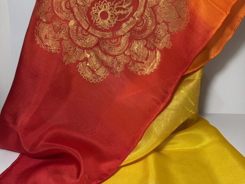 „Foc și Soare” – eșarfă unicat din mătase naturală, pictată manual, 35×130 cm