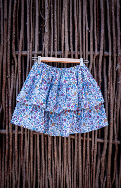 Fustă scurtă albastră cu volane și flori colorate - Fustă damă