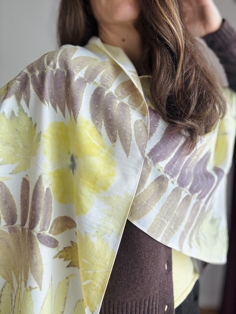 Aurora Botanica – Șal din voal de lână cu imprimeu vegetal (hibiscus, artar si sumac)