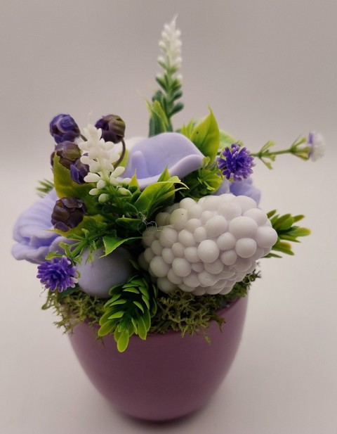 - Material: săpunieră, coloranți pentru săpun, ulei parfumat, spumă de cusut flori, băț de lemn, sârmă metalică, plantă artificială, lipici