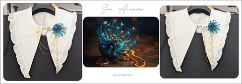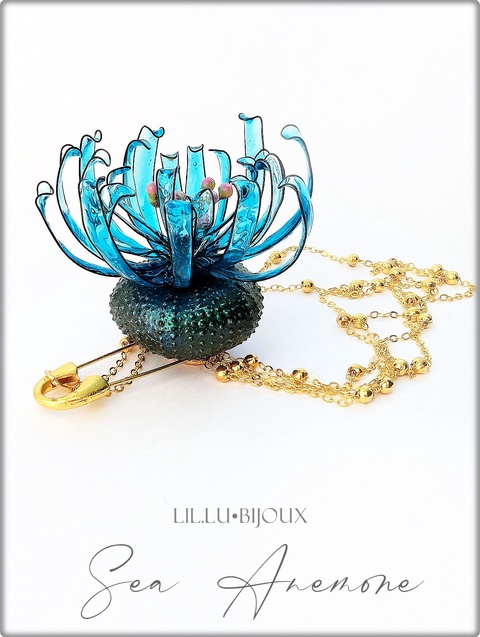 Broșă anemonă de mare artizanală cu arici de mare natural, petale din rășină și lanțuri modulare