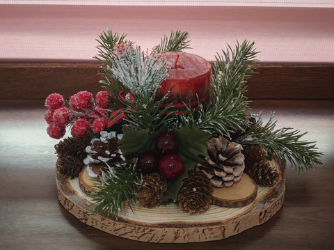 - Material: lumânare decorativă roșie, bază rotundă din lemn natural, ramuri artificiale de brad, conuri de brad naturale, fructe decorative roșii glazurate, boabe decorative lucioase, elemente decorative cu efect de zăpadă
