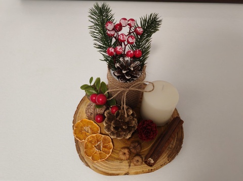 - Material: lemn, natural, bobițe roșii, portocală, lumânare albă, iută, sfoară, scorțișoară, nuci