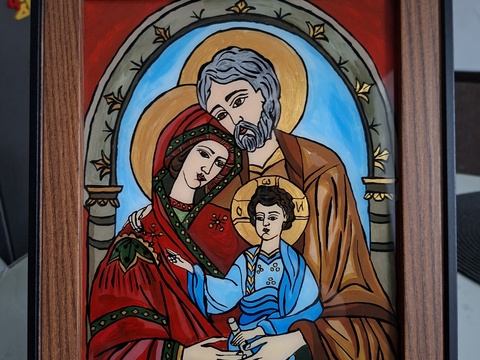 Icoana "Sfanta familie" pictata manual, pe sticla