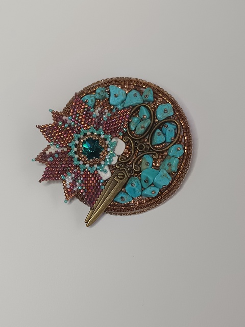 - Material: semipretioase, piele, accesoriu metalic foarfecă bronz, margele