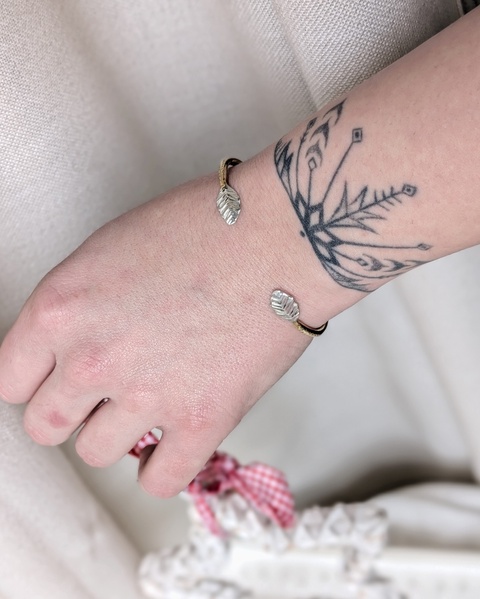 O brățară elegantă și organică, din alamă lustruită, cu frunze delicate din argint la capete. Fiecare frunză este texturată cu nervuri fine, aducând detaliu și naturalețe designului.