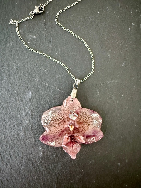 - Material: rasina uv, floare naturala de orhidee, accesorii otel inoxidabil