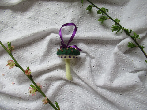Ornament brodat din fetru în formă de ciupercă, decorat cu cristale și fundiță.