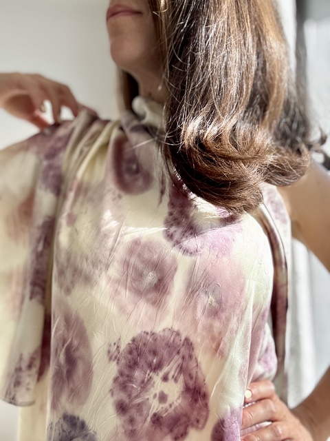 95% mătase naturală, 5% elastan, vopsit vegetal cu flori si frunze, vopsit natural