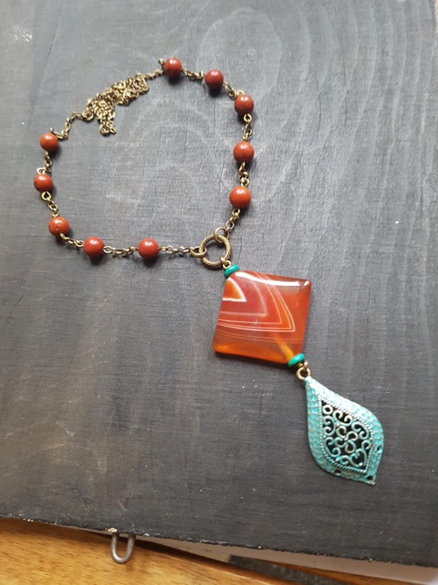 - Material: elemente metalice bronz, chrisocolla, jasp rosu