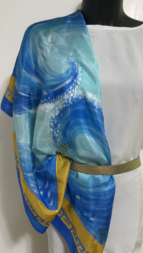 Eșarfă din mătase pictată manual – nuanțe de albastru și turcoaz cu accente aurii (74×74 cm)