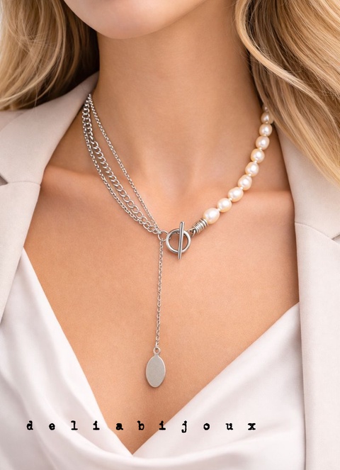 Colier asimetric cu perle de cultură, lanțuri și pandantiv din inox 3 moduri de purtare (cod1368)